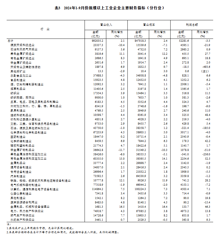 1—9月份,采礦業(yè)實(shí)現(xiàn)利潤(rùn)總額8963.8億元,同比下降10.7%;制造業(yè)實(shí)現(xiàn)利潤(rùn)總額37325.0億元,下降3.8%;電力、熱力、燃?xì)饧八a(chǎn)和供應(yīng)業(yè)實(shí)現(xiàn)利潤(rùn)總額5992.9億元,增長(zhǎng)12.1%。