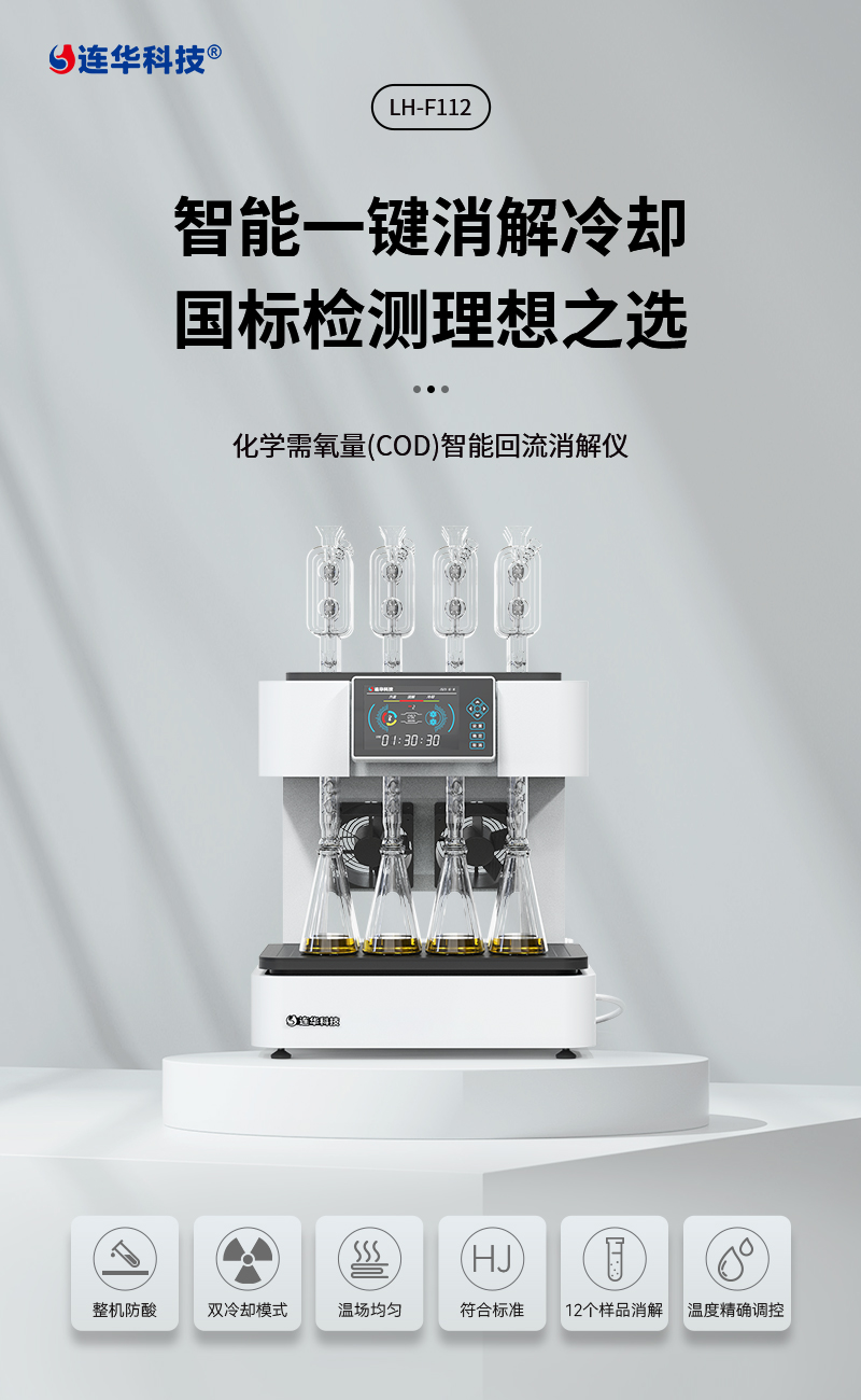化學(xué)需氧量(COD)智能回流消解儀LH-F112  該儀器依據(jù)國家新標(biāo)準(zhǔn)《HJ828-2017  水質(zhì)化學(xué)需氧量的測定重鉻酸鹽法》設(shè)計制造,同時兼顧原國標(biāo),適用于各種生活用水和工業(yè)廢水的檢測,儀器內(nèi)置回流系統(tǒng),可智能定時,操作簡單