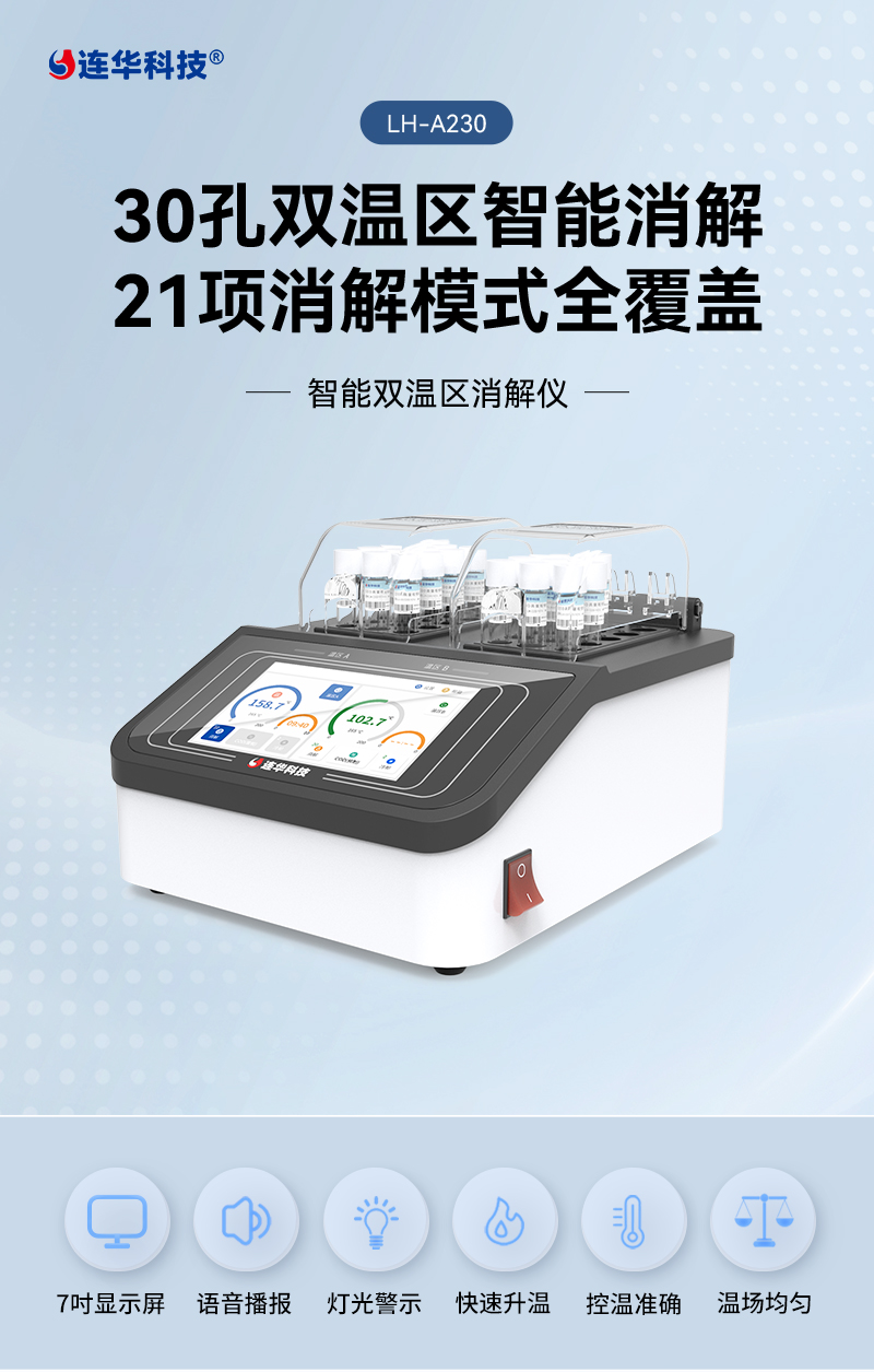 簡要描述: 儀器采用30孔獨立雙溫區設計,可以同時進行兩個項目的消解,效率翻倍。21項消解模式自由設定,支持溫度、時間自由設定,可以靈活應對不同實驗條件的水質檢測工作。7吋高清彩色觸摸屏,搭配了直觀的LHOS系統,可以輕松地進行各種設定,支持語音智能播報和溫區狀態指示燈,消解狀態隨時掌控。