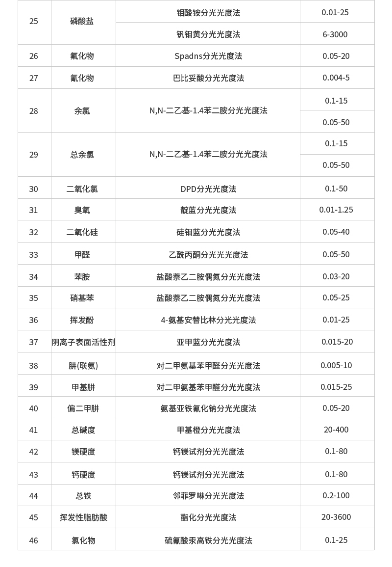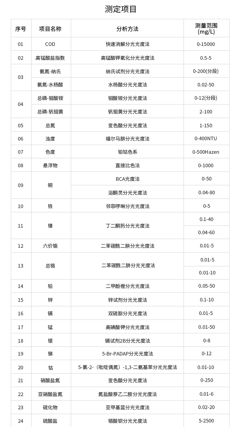 7、預設46項指標,直接測定化學需氧量(COD)、氨氮、總磷、總氮、懸浮物、色度、濁度、重金屬、有機污染物和無機污染物等多項指標,濃度直讀;